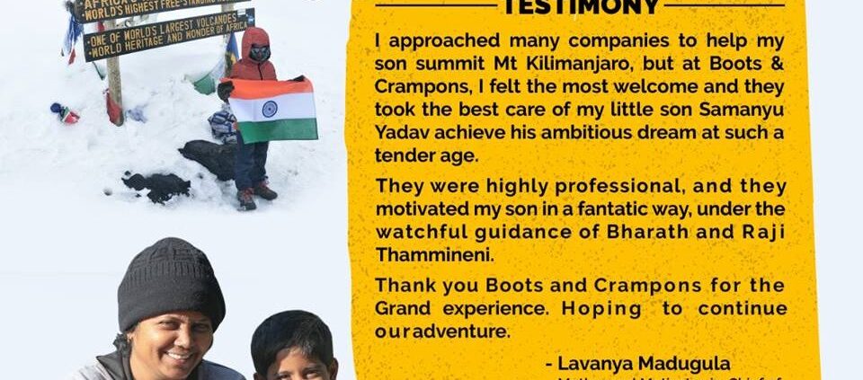 A beautiful Testimony from an inspirational Mother, Lavanya Madugula, Mother and Motivator-in-Chief of Samanyu Yadav – One of the youngest in the world to Scale Mt. Kilimanjaro under the leadership of Bharath Thammineni of Boots&Crampons.