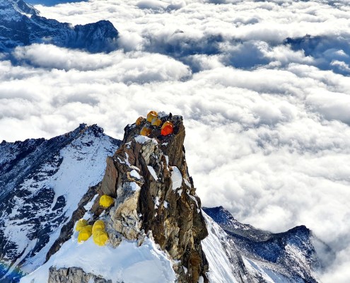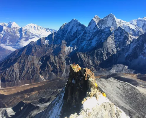 The expedition begins with the classic Everest approach before transitioning into a highly technical climb involving exposed ridges, steep ice walls, mixed rock sections, ladders, and fixed ropes. Camps are perched dramatically on narrow ridgelines, adding intensity and exposure at every stage. The famous Yellow Tower, Mushroom Ridge, and summit ridge provide some of the most adrenaline-filled climbing moments in the Himalayas.