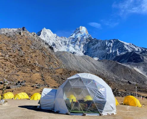 Today’s trek will take you to the iconic Ama Dablam Base Camp, situated at 4,600 meters. The journey offers stunning views of the surrounding peaks, including Ama Dablam itself. The trek is challenging but rewarding as you approach the base of one of the most beautiful mountains in the world. Upon reaching Base Camp, you’ll settle in and prepare for the upcoming climbing period.
