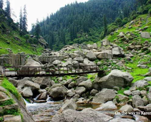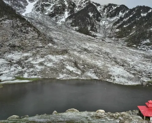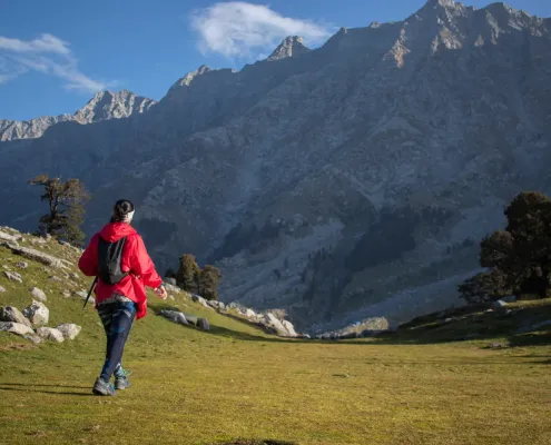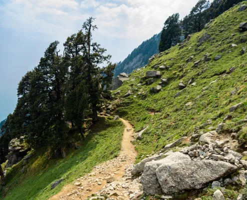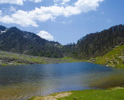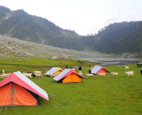 Trek across rocky landscapes and high ridges, stopping at Kalikund and Naghar, eventually reaching the crystal-clear Kareri Lake, surrounded by meadows and pine forests.