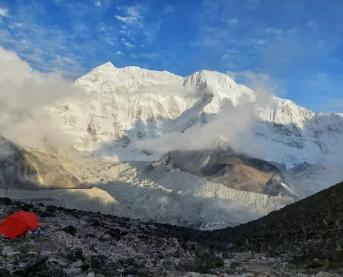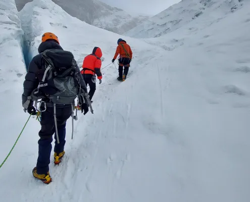 Steady ascent toward Island Peak Base Camp. Receive climbing training including rope techniques, harness use, and safety procedures.