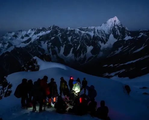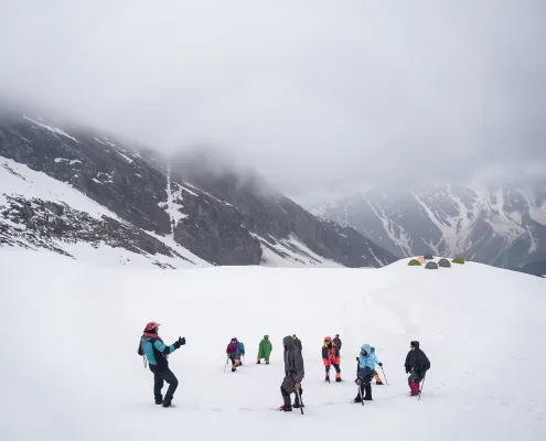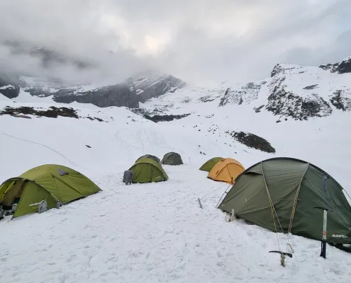 This day is dedicated to acclimatization and preparation for the summit attempt. After breakfast, we carry essential supplies and equipment toward the summit camp, ferrying loads to higher altitude. This activity helps in acclimatization and prepares the route for the upcoming move. After depositing supplies, we descend back to Lady Leg. The rest of the day is spent resting, hydrating, and attending technical briefings as required. Overnight stay in tents at Lady Leg.