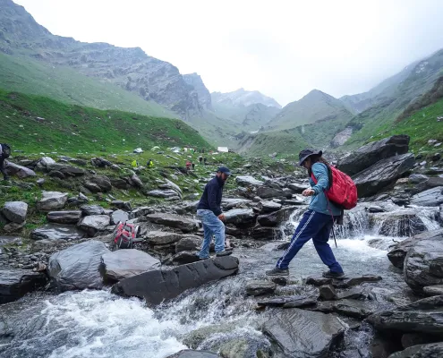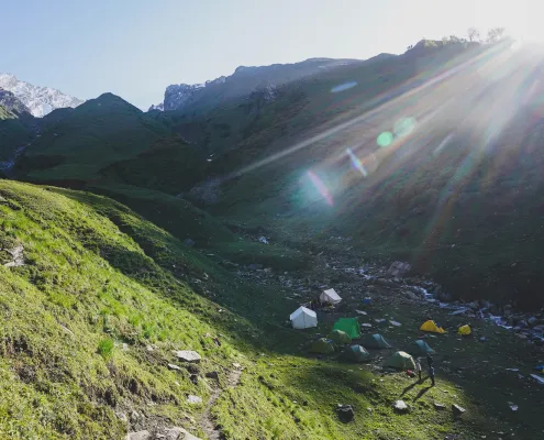 After an early breakfast, we drive to Dhundi, the road-head of the trek, passing through Solang Valley and along the banks of the Beas River. From Dhundi, we begin our trek toward Bakarthach, following a well-marked trail through open alpine meadows and glacial terrain. The gradual ascent helps with acclimatization and offers scenic views of the surrounding peaks. The trek takes approximately 4 to 5 hours. Upon reaching Bakarthach, we set up camp and rest for the evening. Overnight stay in tents at Bakarthach.