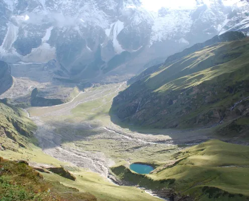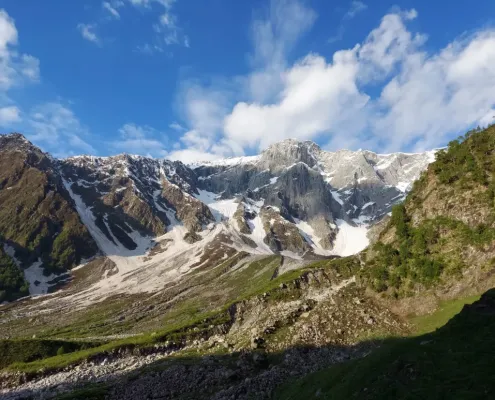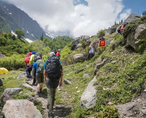 After an early breakfast, we drive to Dhundi, the road-head of the trek, passing through Solang Valley and scenic mountain roads. From Dhundi, we begin our trek toward Bakarthach, following the Beas River through alpine meadows and glacial landscapes. The trail gradually ascends and offers beautiful views of surrounding peaks and valleys. The trek takes approximately 4 to 5 hours. On arrival at Bakarthach, we set up camp and rest. Overnight stay in tents at Bakarthach.