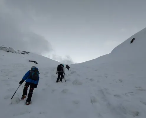 This day is dedicated to acclimatization and preparation for the summit phase. After breakfast, we carry essential supplies and equipment toward the summit camp route, ferrying loads to higher altitude. This process helps establish the route and improves acclimatization. After depositing supplies, we return to Lady Leg for rest. The remainder of the day is spent attending technical briefings, practicing movement techniques if required, and conserving energy. Overnight stay in tents at Lady Leg.