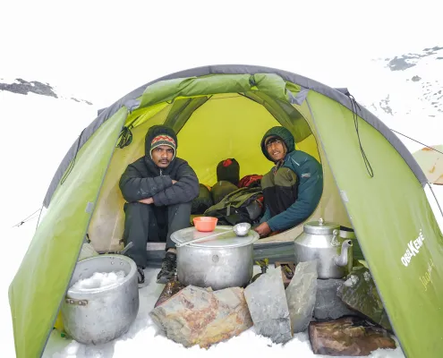 We start early for the ascent of Mt. Shetidhar. The climb involves negotiating snow slopes and high-altitude terrain, offering a rewarding yet manageable challenge. After reaching the summit and enjoying expansive views of surrounding peaks and valleys, we begin our descent back to Lady Leg. The round trip takes approximately 8 to 9 hours. On arrival, we relax and celebrate the completion of both summits. Overnight stay in tents at Lady Leg.