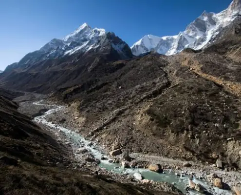 The trek includes river valleys, rocky trails, glacial moraines, and high alpine meadows, with continuous views of major Himalayan peaks.