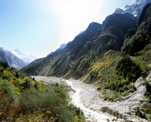 After breakfast, a 4-hour drive takes us to the holy town of Gangotri, where the trek begins. We visit the famous Gangotri temple before trekking along the Bhagirathi River. The path offers stunning views of the Bhagirathi peaks, leading us to Chirbasa, where we camp by the river.