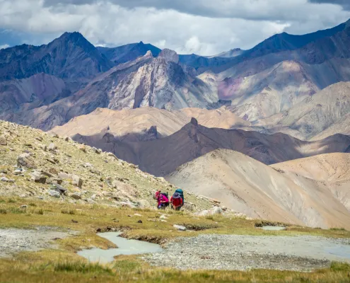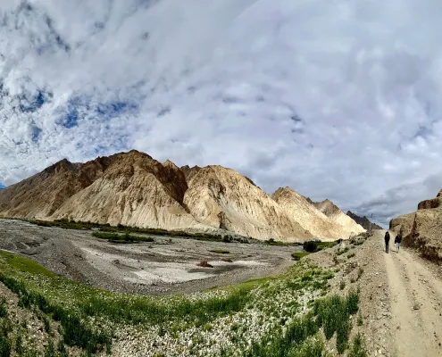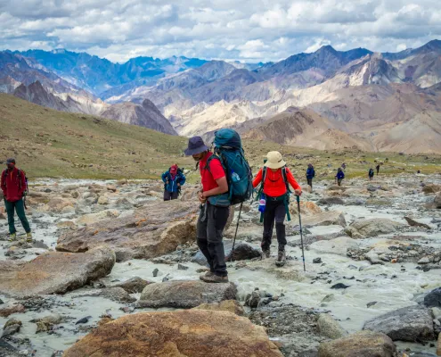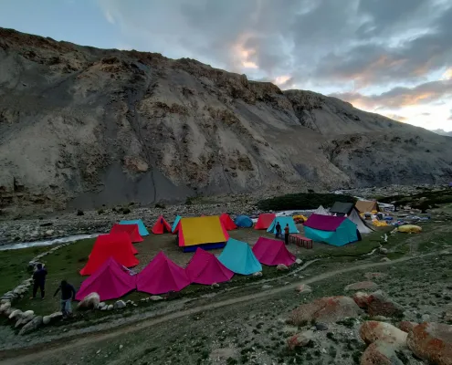 The route opens up into vast plains before the final push to base camp. As you gain altitude, Kang Yatse II starts dominating the skyline. Camp here, surrounded by silence and snow-peaked majesty.