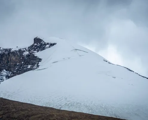 This climb includes high-altitude trekking trails, rocky slopes, glacier travel, snow-covered slopes, and exposed summit sections. The final summit push involves steep snow and ice terrain, where crampons and an ice axe are used.