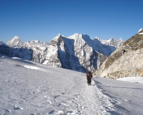 An easy but steady trek to the base of Island Peak. As you approach, the impressive south face of Lhotse dominates the skyline. At base camp, review your gear, practice some basic techniques if needed, and prepare for the big day.