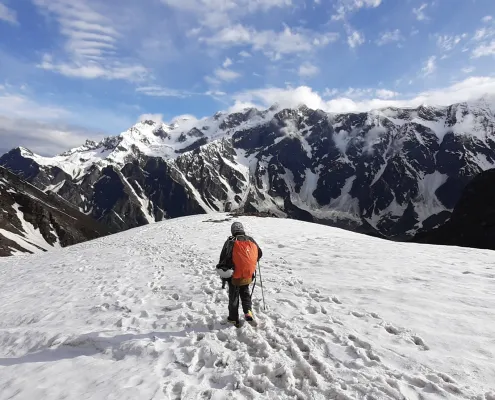 The journey unfolds through changing landscapes — from green valleys and alpine meadows to stark, wind-swept ridges and snow-covered slopes. As altitude increases, the environment becomes harsher and more demanding. Nights are colder, oxygen levels drop, and each day requires careful pacing and recovery. Summit day is a steady, sustained push on snow and mixed terrain, where fitness and mental discipline matter more than speed.