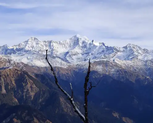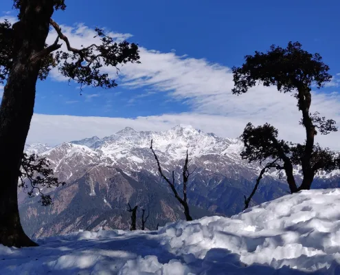 Trek from Kuari to Mukta Tal. The trail transitions from forested paths to rocky alpine terrain. Reach Mukta Tal, a serene alpine lake surrounded by stunning Himalayan views. During winter, snow blankets the area, offering spectacular sights of Bandarpoonch, Kalanag, and the Gangotri massif.