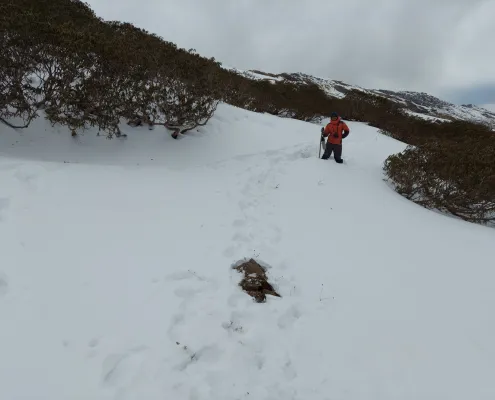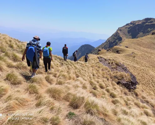 The trail ascends steadily through open grasslands and expansive ridgelines. From the top, enjoy panoramic views of the surrounding Himalayan ranges and vast rolling meadows stretching endlessly.