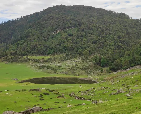 Panar Bugyal’s rolling meadows feel endless, with unobstructed views of surrounding peaks and sky. The open terrain exposes trekkers to wind and weather, adding to the high-mountain feel. The approach to Toli Tal introduces rocky paths and gradual climbs, culminating at a serene lake tucked into an alpine basin.