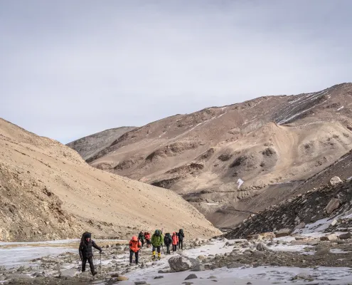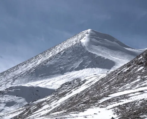 The UT Ladakh Kangri peak, located in the upper valley of Rumtse village, is a prominent snow-covered peak that was recently explored and successfully climbed by local mountaineers from the Ladakh Mountain Guides Association in 2019. This peak is an ideal choice for novice mountaineers who are looking to climb a six-thousander as it is considered a moderate climb that offers an appropriate terrain for practicing technical skills.